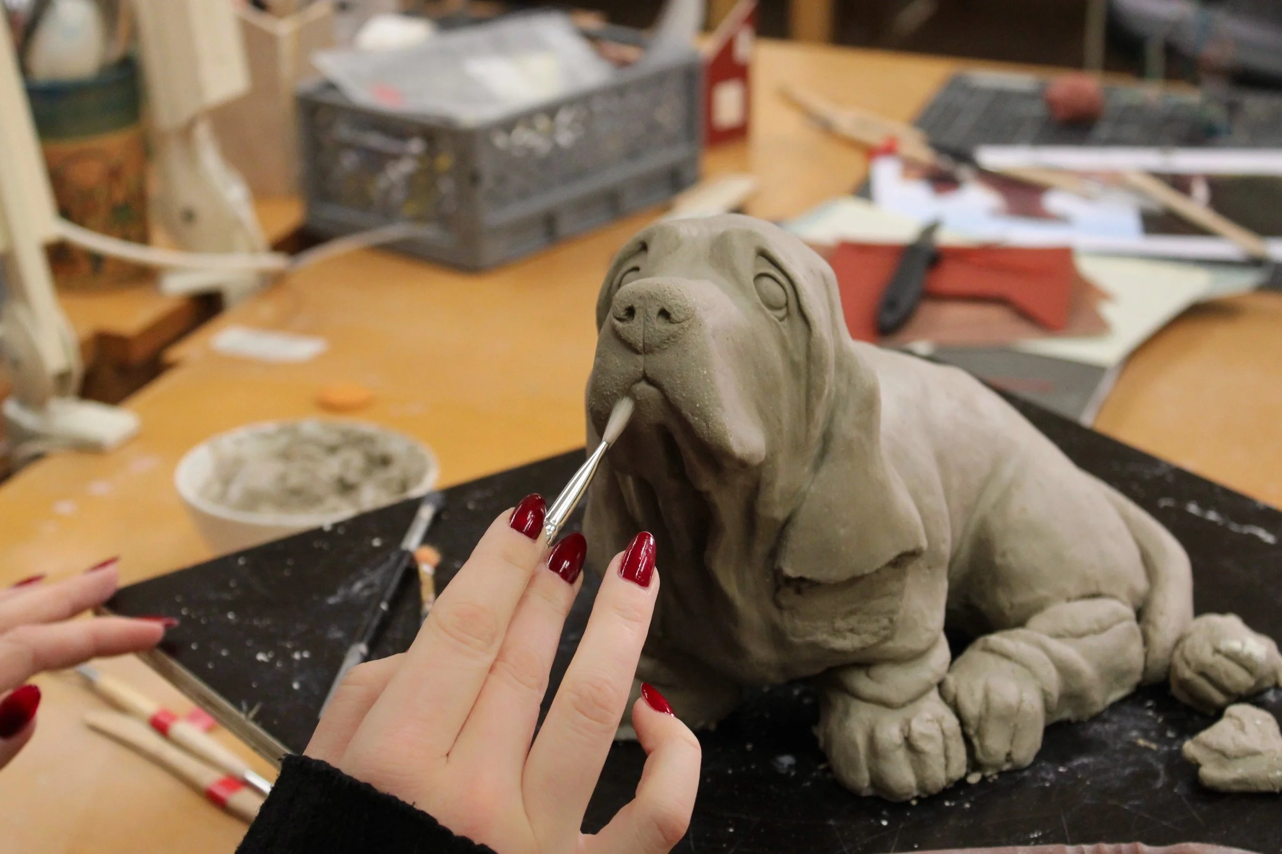 Pågående utbildning inom form och gestaltning. Hundvalp i stengodslera, skala 1:1.